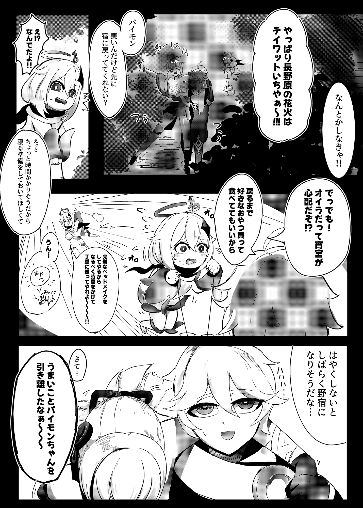 酔っぱらった宵●のさらしが緩んでいることに気づいた旅人はパイモンを先に行かせ、直してあげようとするが…。