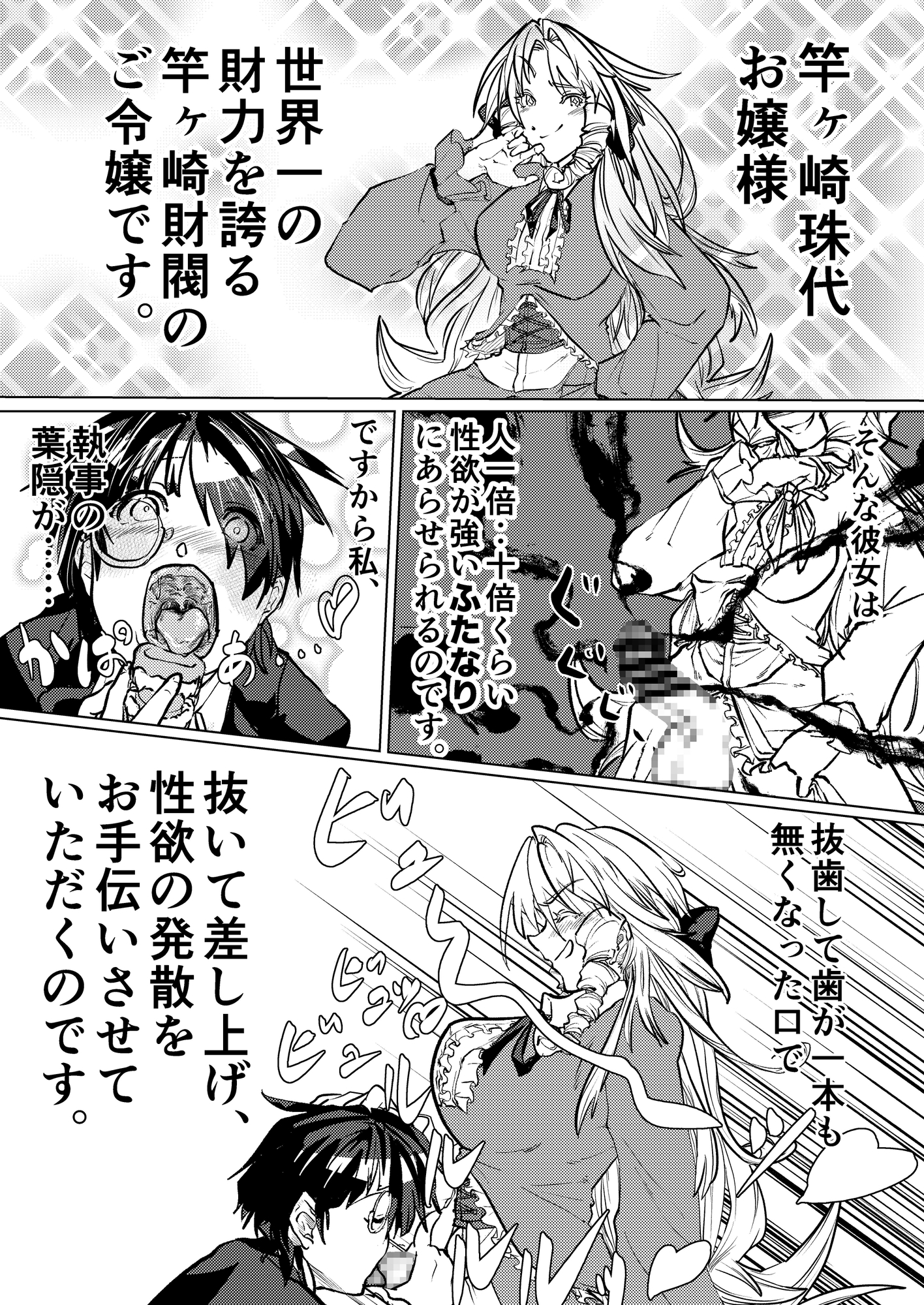 竿ヶ崎財閥の令嬢・竿ヶ崎珠代は、いつものように執事の葉隠正太郎を好き勝手していた。葉隠のお尻を掘ろうとしたその瞬間、珠代は別の第三者の精液の匂いに気付く。珠代は葉隠を犯した者を「精敗」するために性液の匂いの主の元へ向かう。