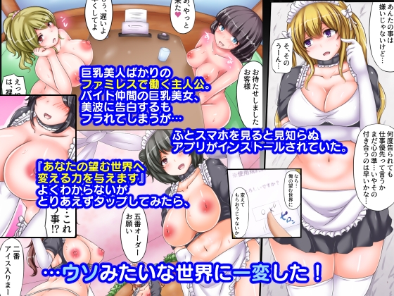 アプリの力で妄想が現実になっちゃって、どすけべデカパイ店員さんたちとヤリまくれる都合のよすぎるハーレムストーリー。