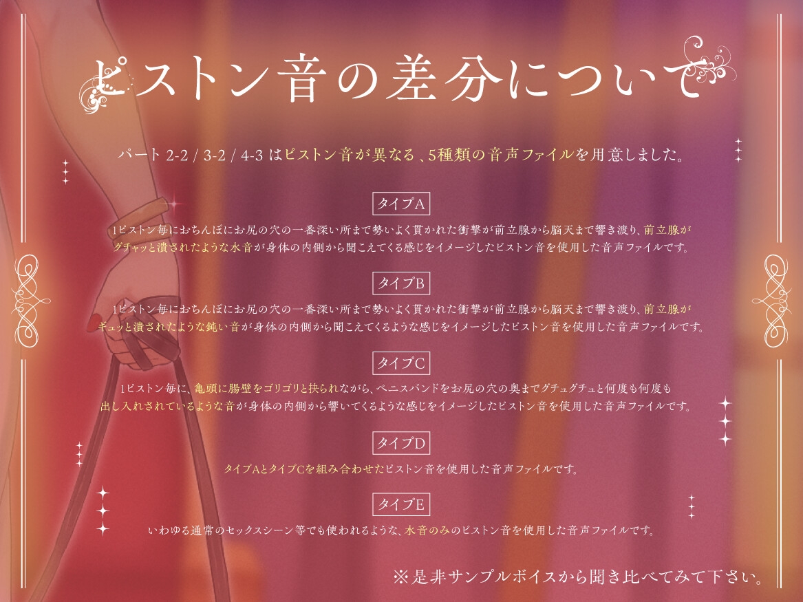 1ピストン毎におちんぽにお尻の穴の一番深い所まで勢いよく貫かれた衝撃が前立腺から脳天まで響き渡り、前立腺がグチャッと潰されたような水音が身体の内側から聞こえてくる感じをイメージしたピストン音を使用した音声ファイルです。