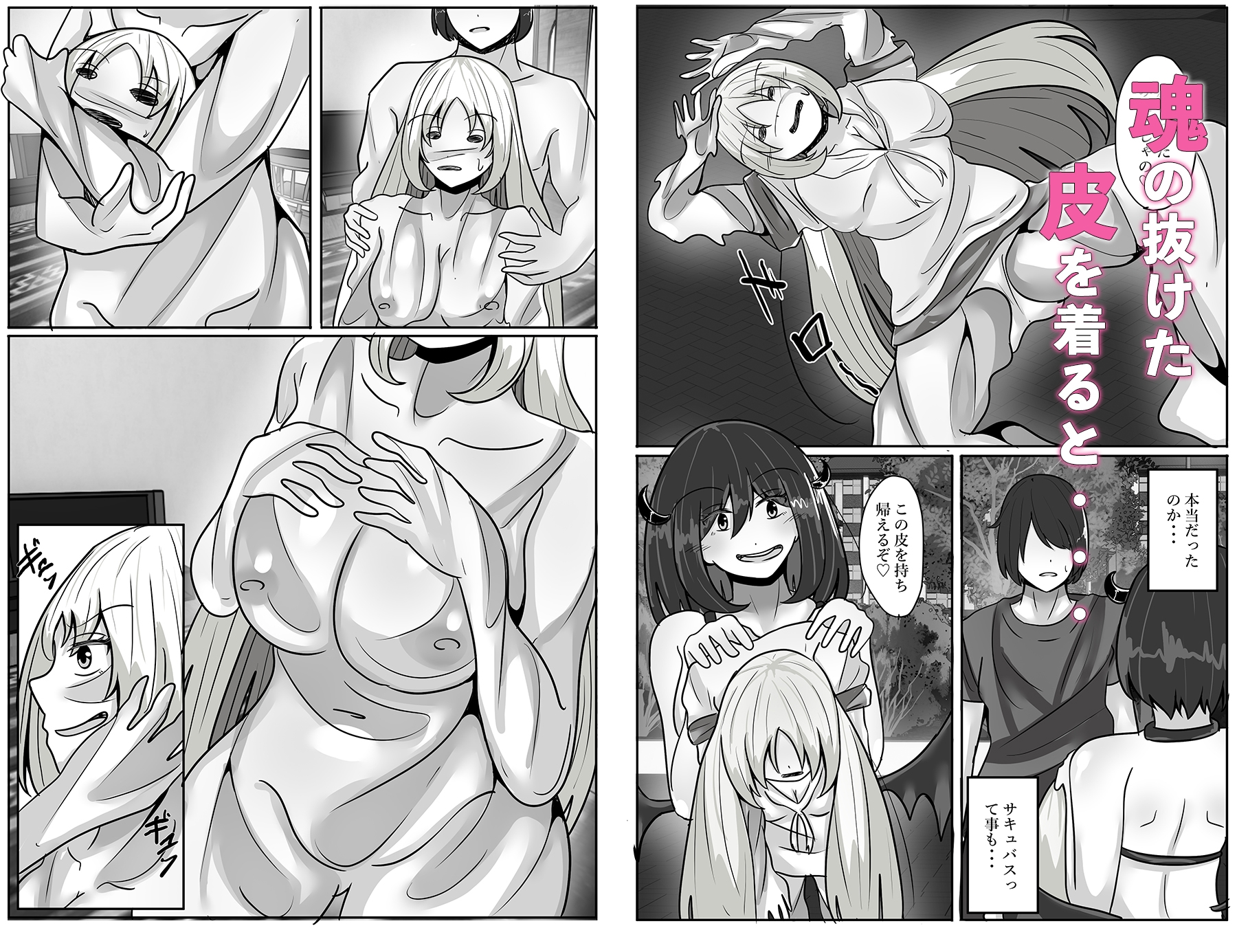 精力の強い男を探していたサキュバスが、家にやってくる。女の子を皮にして、体を乗っ取る能力を持っていた。好きな子の体にする代わりに、精力をもらう約束をする。精力をもらう方法は、エッチをすることだった。