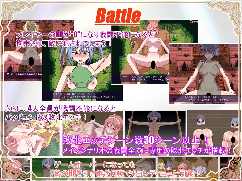 一方戦闘では、不利な敵に服を脱がされる。敗北したら捕らわれ犯される。パーティメンバー全員が敗北するとバッドエンドとなり凌○され尽くす。など、エロRPGらしいセクシャルなイベントもふんだんに取り入れられています。