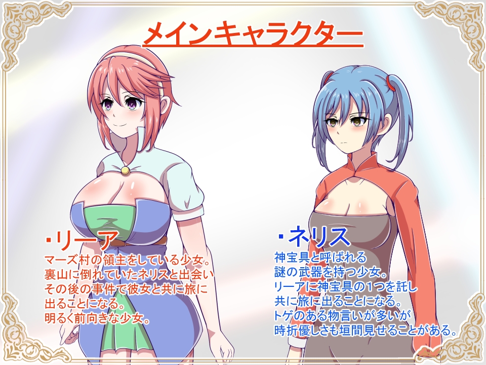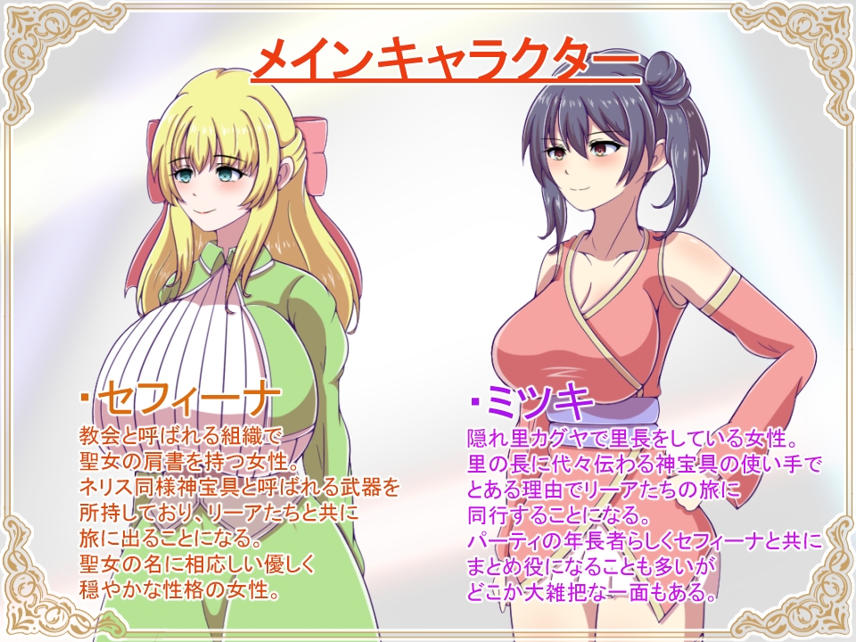 本作にはメインキャラクターである、リーア・ネリス・セフィーナ・ミツキの4人の他にも様々なサブキャラクター・敵キャラクターが登場します。