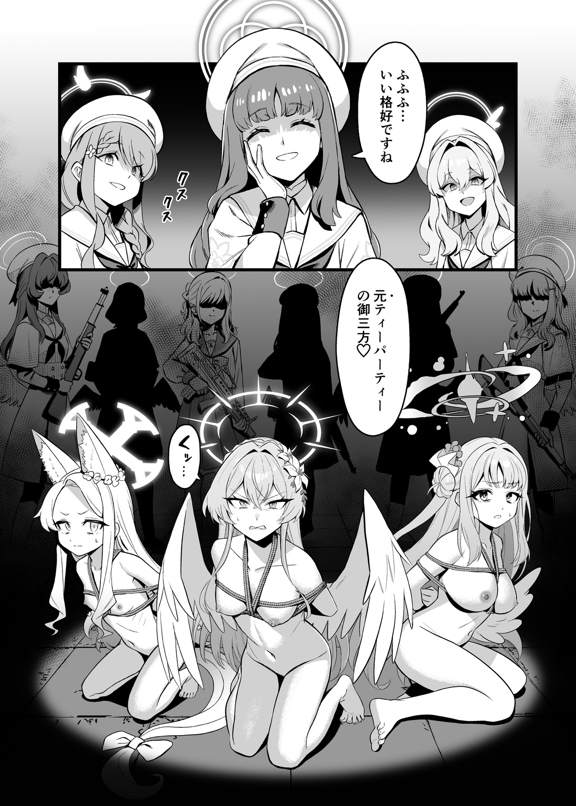 コミックマーケット105発行、ブルアカの二次創作同人誌です! トリニティ総合学園ティー○ーティーの3人がトリカス(邪悪なトリニティモブ生徒)達に捕縛され、ひどい目に遭う内容です。
