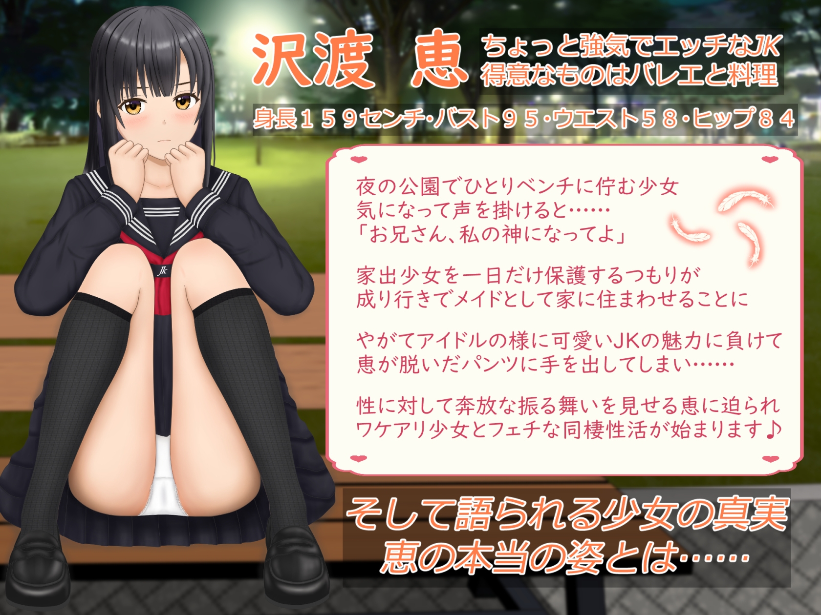 【KU100】神待ちJKを一日だけ保護するつもりが同棲することに…やがてエッチに積極的なJKに迫られて様々なプレイを楽しむようになるお話です。相互オナニー、シックスナイン、隠語、耳舐め、オホ声、バブみ風授乳手コキやJKの脱ぎたてパンツを楽しんだりなど、フェチなプレイも盛りだくさんの3時間!