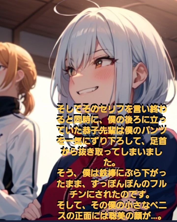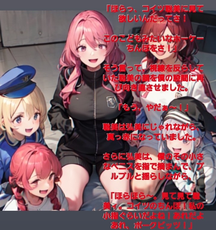 チビで軟弱な○校生の主人公はが先輩の女子グループにいじめられ、パンツを脱がされてフルチンにされ、短小包茎の赤ちゃんチンポを晒し者にされるCFNMストーリー。