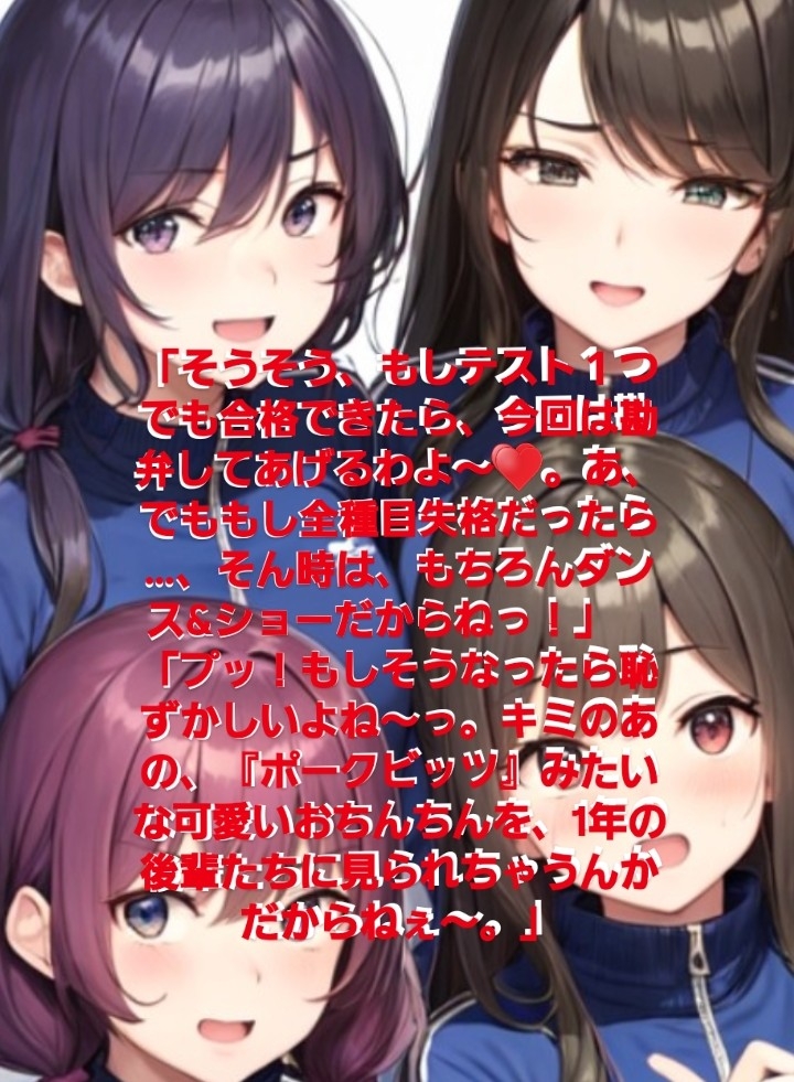 元女子校に入学した主人公が、先輩の女子達にいじめられて、大勢の女の子たちの見ている目の前でパンツを取り上げられて全裸にされ、子どもの様な短小包茎を笑われて、辱しめられる小説です。