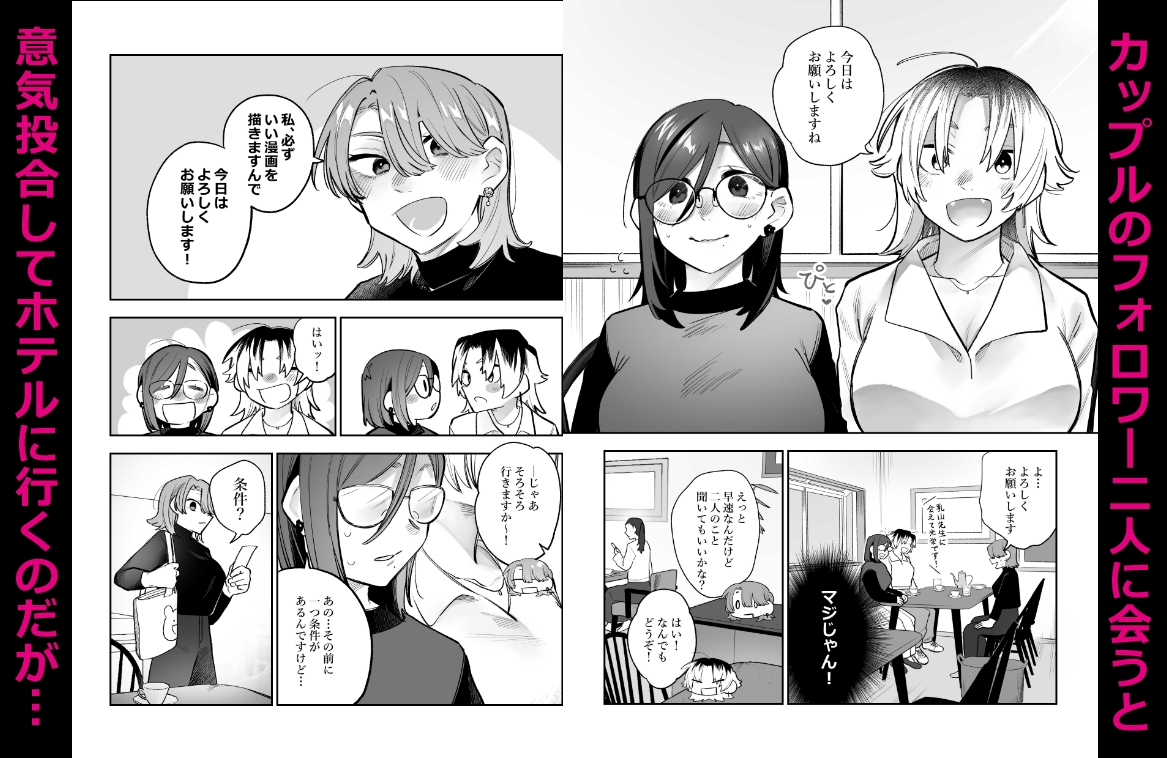 「次新刊出せないと生活ができない…」そう嘆く成人向け百合同人作家・乳山オメ子(ペンネーム)はおもむろに「女同士のセックスが見たい」とSNSでつぶやいてしまう。
