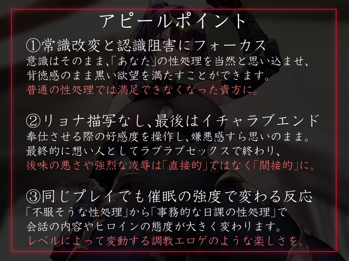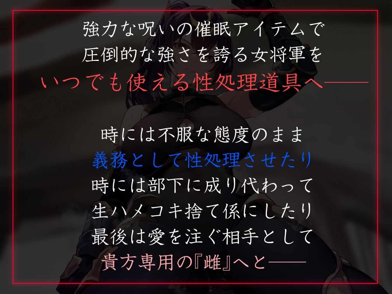 超人的な強さを誇る女騎士として名高い将軍を催◯能力で常識改変し、意識や性格そのままに「あなた」への性処理をこなすようになり最終的にイチャラブエンドのライトな催◯(かける側)音声!