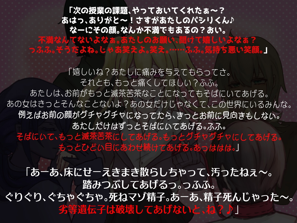 逆ハーレム×支配&服従×人間関係に重点を置いたSM作品です。本作ではドミナントでS女子な”あたし”と幼馴染でドマゾな”パシリくん”の秘密の関係をお届けします。去勢寸前まで追い込まれる金蹴りや玉責め、支配や女性優位が好きな方、好きな女の子が他の男と仲良くしているのを見て悔しくて興奮してしまうマゾの方はぜひご購入ください。