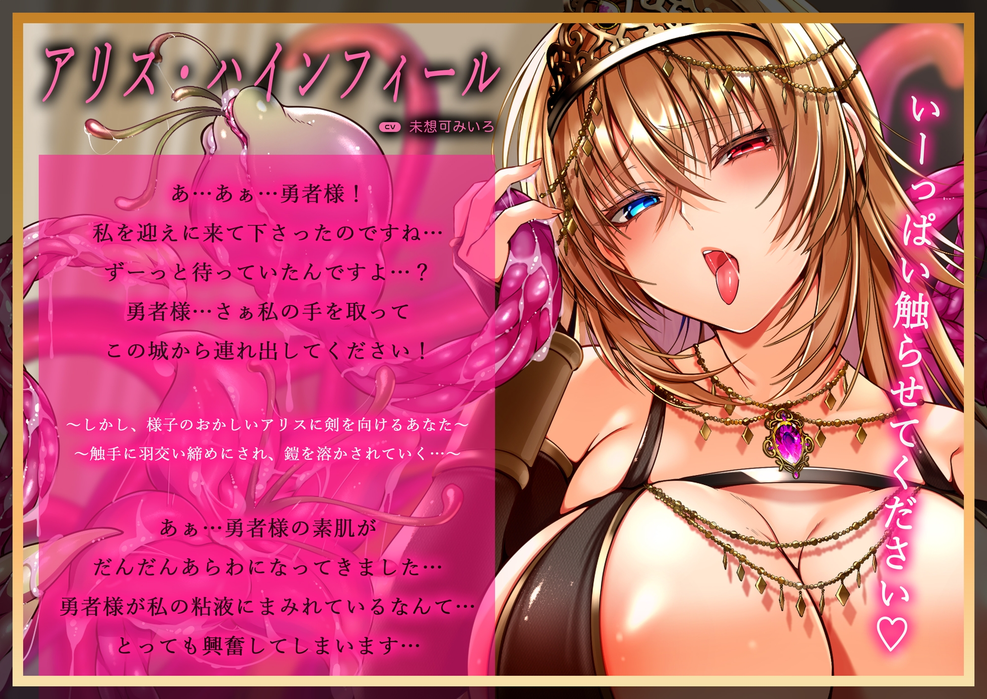 冒険を終えあなたを待っていた姫「アリス」の元へやっと帰国することができました。 しかしすでにアリスの体は乗っ取られており、以前とは変わり果てた姿になってしまっていました。 触手に支配されてしまったアリスは、あなたの身動きを封じ、全身に絡みついてきます。 媚薬効果のある粘液で耳をジュポジュポされると、徐々に全身が快楽に支配されてしまうことに。