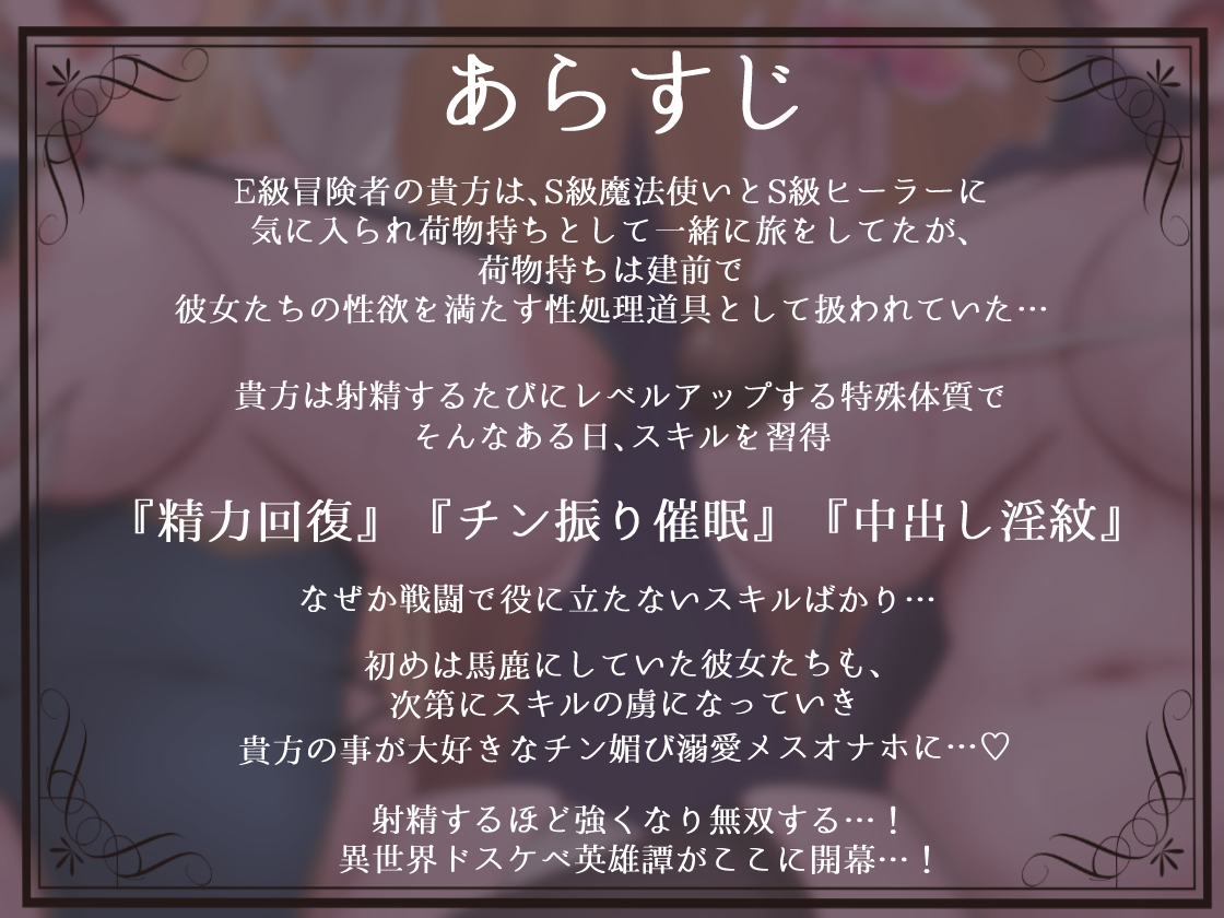 彼女たちの性欲を満たす性処理道具として扱われていたE級冒険者の貴方… しかし、貴方は射精するたびにレベルアップする特殊体質で…ある日とうとうスキルを習得…『精力回復』『チン振り催○』『中出し淫紋』 なぜか戦闘で役に立たないスキルばかり… 初めは馬鹿にしていたS級の彼女たちも、次第にスキルの虜になっていき、貴方の事が大好きなちん媚び溺愛メスオナホに…射精すればするほど強くなり無双する異世界ドスケベ英雄譚!