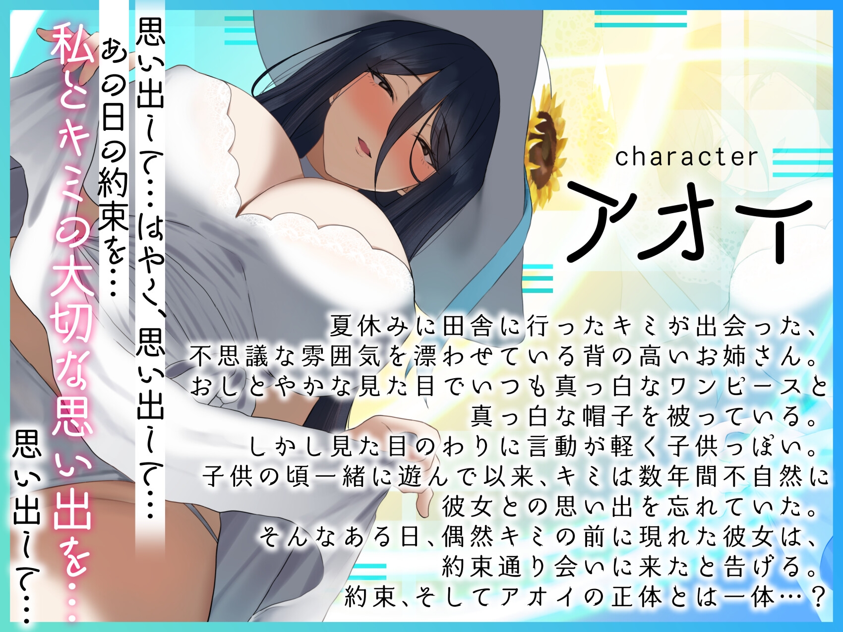 夏休みに田舎に行ったキミが出会った、不思議な雰囲気を漂わせている背の高いお姉さん。 おしとやかな見た目でいつも真っ白なワンピースと真っ白な帽子を被っている。 しかし見た目のわりに言動が軽く子供っぽい。 子供の頃一緒に遊んで以来、キミは数年間不自然に彼女との思い出を忘れていた。 そんなある日、偶然キミの前に現れた彼女は、約束通り会いに来たと告げる。 約束、そしてアオイの正体とは一体…?