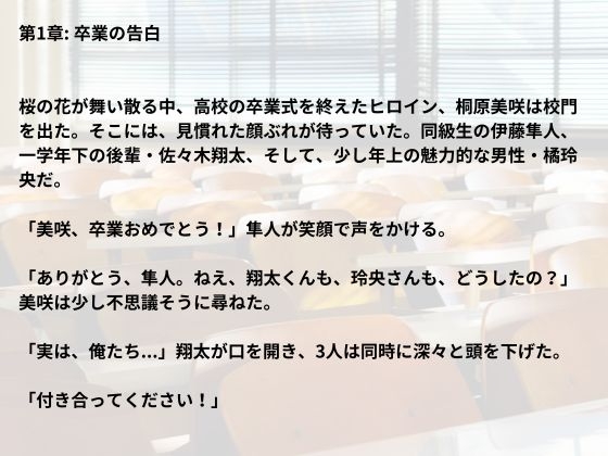 卒業式を終えたヒロイン・美咲は、3人の男性から突然の告白を受ける。彼女は、セックスの相性を理由に、一人ずつベッドを共にする大胆な選択をする。後輩の翔太、同級生の隼人、年上の玲央。それぞれのペニスがもたらす快楽に溺れ、美咲は誰を選ぶべきか悩む。甘く淫らな夜を経て、彼女は究極の提案をする。「4Pしよう」。4人の欲望が絡み合う、官能の物語。美咲は誰の愛を受け入れ、どんな快楽に身を委ねるのか。官能と愛のドラマが、今、始まる。