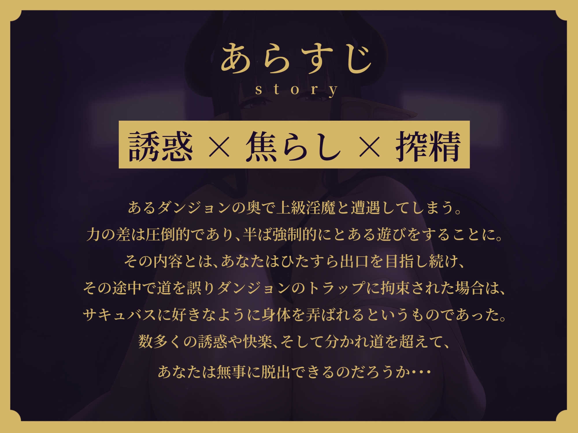 あなたはダンジョンを探索する冒険者。探索したダンジョンは難易度が低く最奥部まで辿りつくことができたが、そこで淫魔が姿を現す。サキュバスとの力の差を見せつけられたあなたは、半ば強○的にとある”遊び”をすることになる。 “遊び”とは、冒険者がトラップになるべくかからないよう出口まで逃げるというもの。 出口に辿りつく間には拘束トラップが複数あり、トラップにかかると淫魔に身動きが取れない身体を弄ばれてしまう。