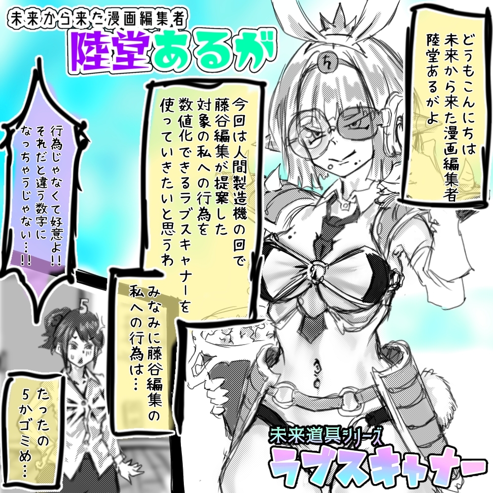 未来から来た漫画編集者の陸堂あるがが未来の道具や未来の漫画編集者あるあるを紹介するシリーズ。