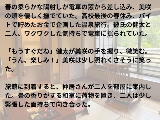 春休み、高校カップルの美咲と健太は、バイトで貯めたお金で温泉旅行を計画する。電車に揺られ、旅館に到着した二人は、記念の初エッチを楽しむ。しかし、セックスの後に一人で温泉に入った美咲は、男湯と間違え、見知らぬ男性に誘われるまま禁断の行為に溺れる。彼のペニスの大きさとテクニックに翻弄され、美咲は自分の中にある欲望に気づく。