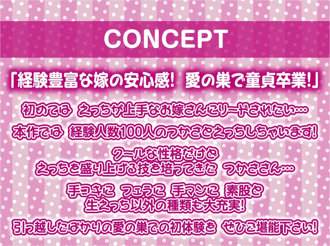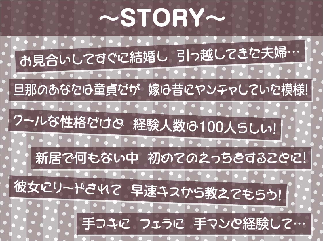 お見合いして すぐに結婚し 引っ越してきた夫婦… 旦那のあなたは童貞だが 嫁は昔にヤンチャしていた模様! クールな性格だけど 経験人数は100人らしい! 新居で何もない中 初めてのえっちをすることに! 彼女にリードされて 早速キスから教えてもらう! 手コキにフェラに 手マンと経験して…