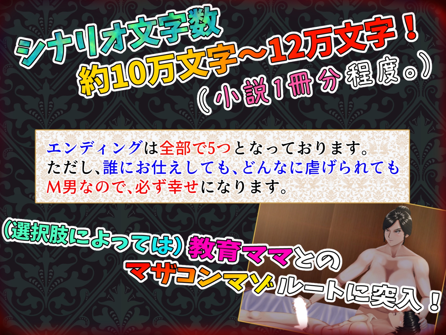 M男が、毒親ぎみのママや、小悪魔な同級生、理不尽な鬼上司などの悪女にお仕えすることになるものの、かなり虐げられてもM男なので結局は幸せになってしまうゲームです。