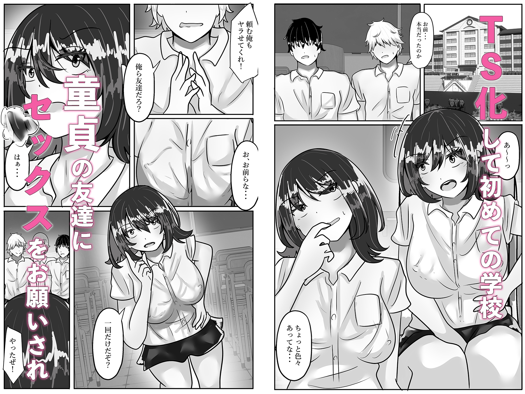朝起きたら、TS化していた。夢で魔女に女の子になれる皮をもらい、興味本位で皮を着ると、本当に女体化した。しかし、それは現実だった。男友達を呼び体を触られると、とても敏感だった。乳首をイジられ、簡単にイッてしまう。そして、女体化して初めてのセックスをしてしまう。段々、女の快楽に支配されメス堕ちする。