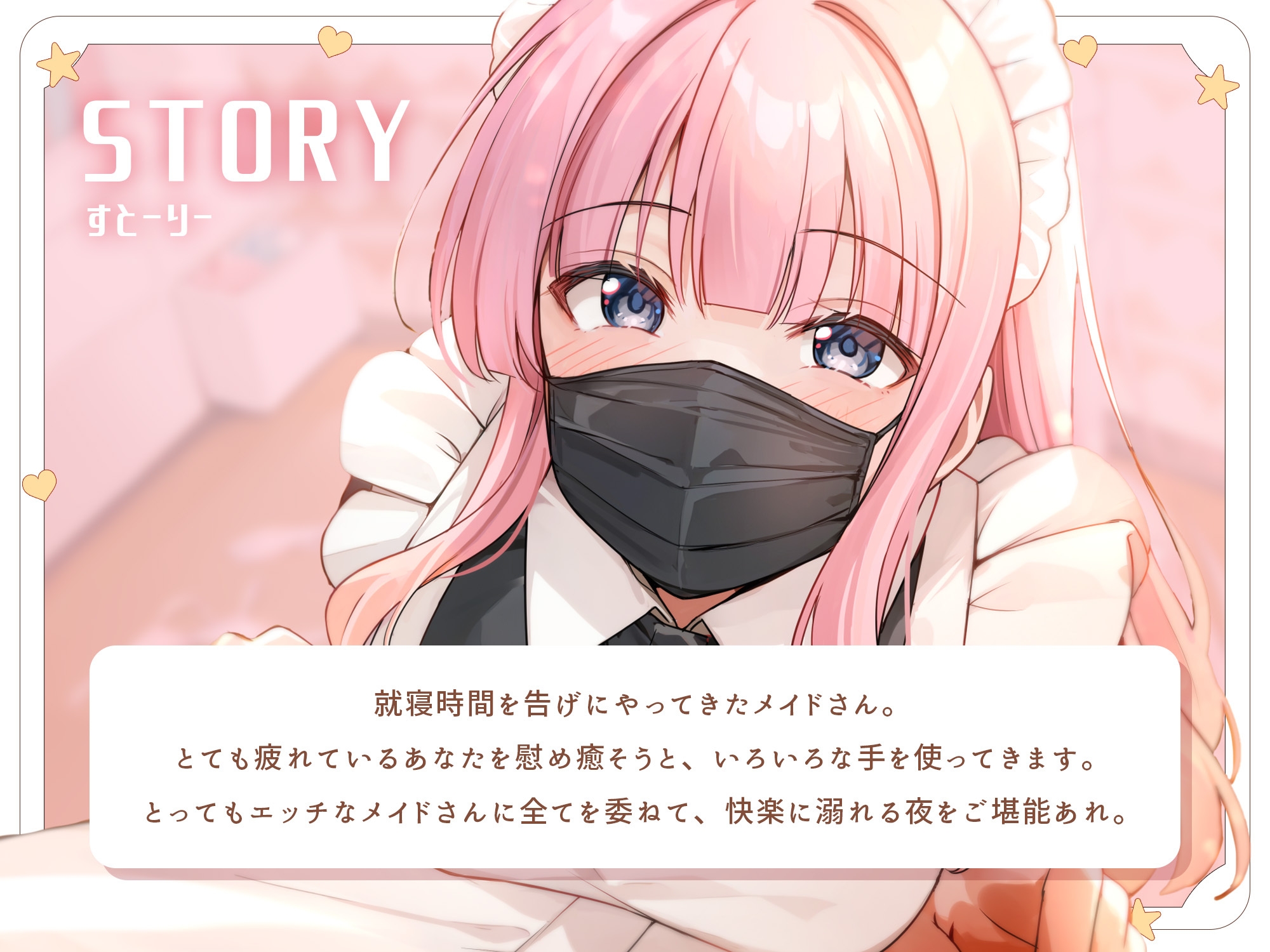 就寝時間を告げにやってきたメイドさん。とても疲れているあなたを慰め癒そうと、いろいろな手を使ってきます。とってもエッチなメイドさんに全てを委ねて、快楽に溺れる夜をご堪能あれ。