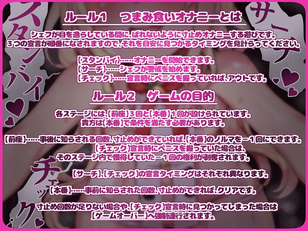 乳首いじりをしながら、バレないように寸止めオナニーをする音声です!『スタンバイ』=シコシコ開始、『サーチ』=そろそろやばい、『チェック』=アウト!バイノーラル収録作品!