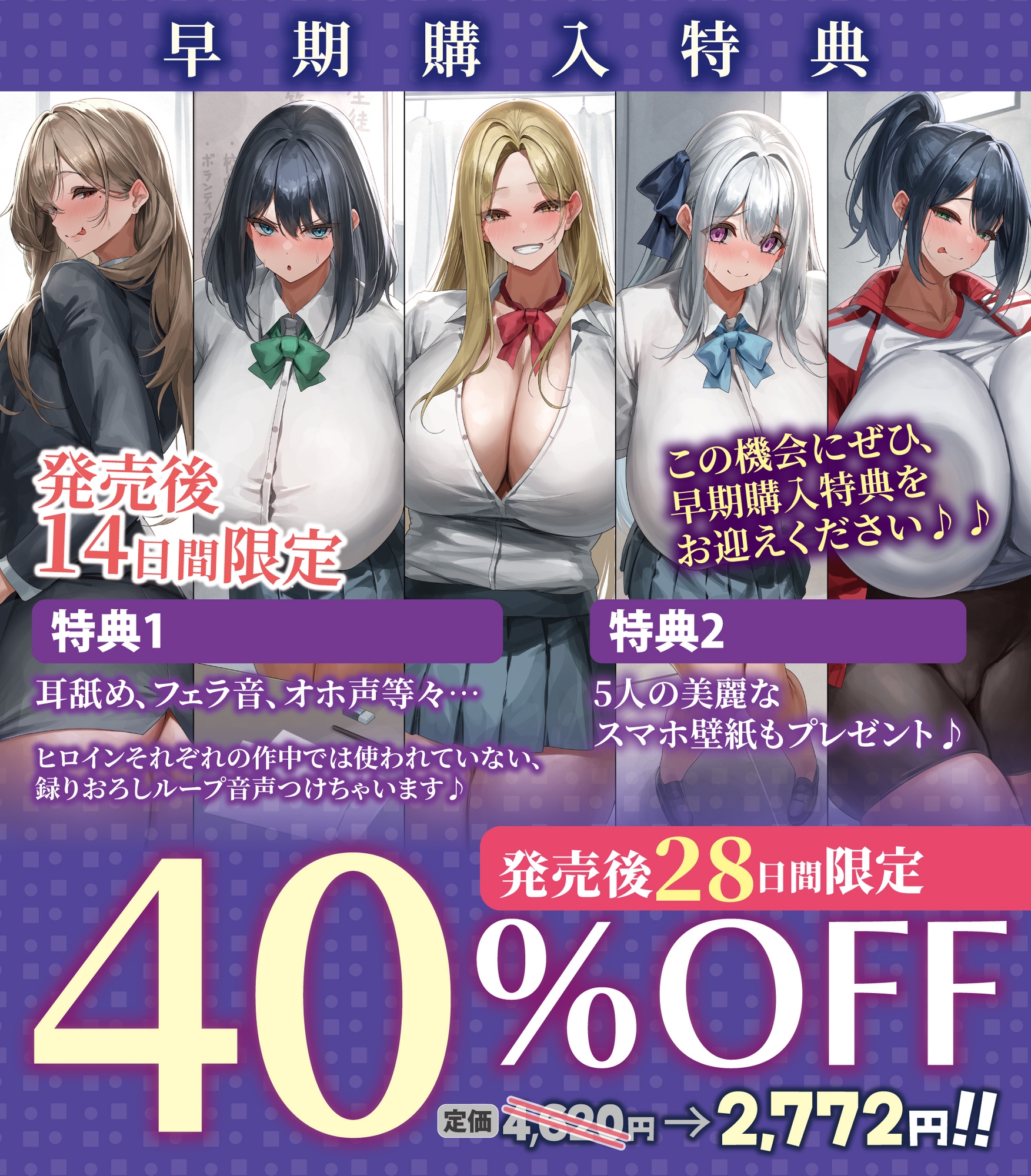 CV御苑生メイ様/分倍河原シホ様/御子柴泉様/餅梨あむ様/葵時緒様が演じる、ドスケベボディの淫乱ヒロイン達に求められまくるセックスライフをご堪能ください♪