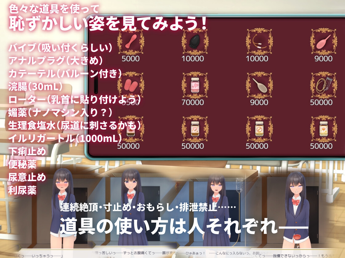 女の子にバイブやアナルプラグ、浣腸や尿道カテーテルなどの道具を付けて、反応を楽しむシミュレーションゲームです。
