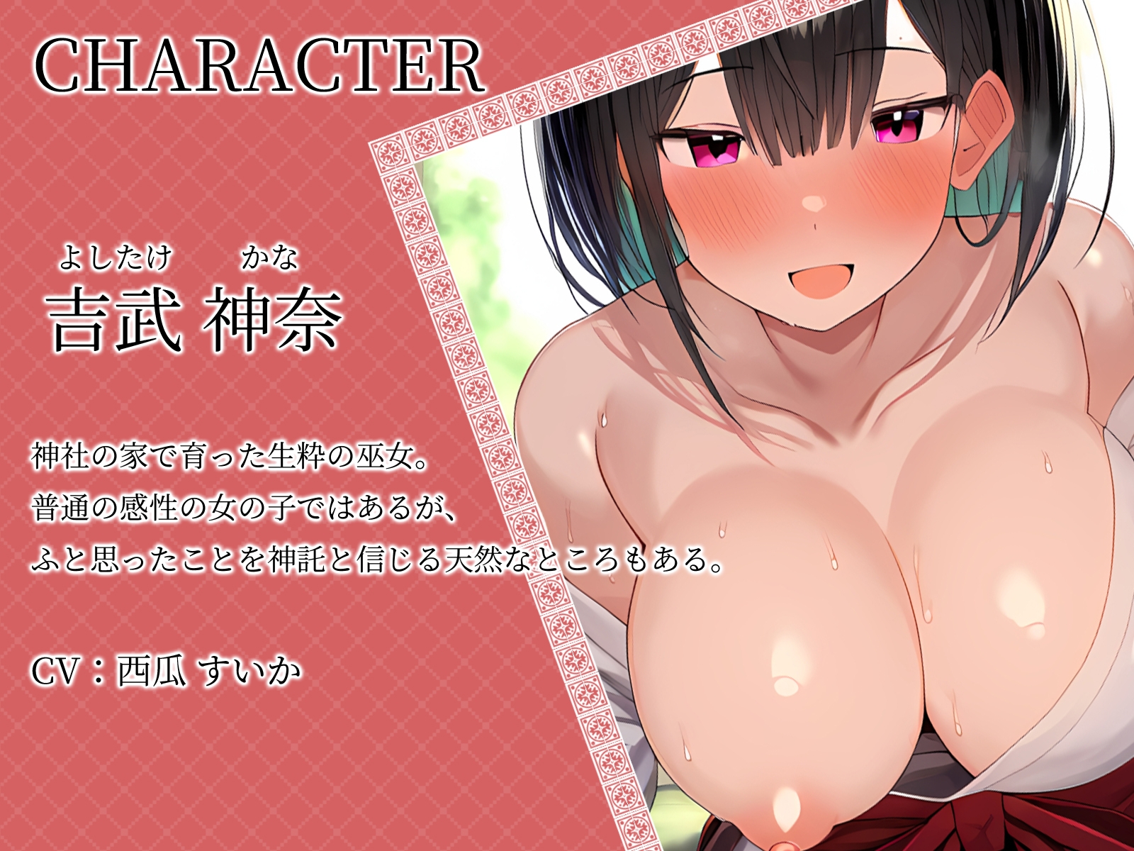 『こんにちは、参拝ですか?突然お声がけしてすみません。私は、この神社の巫女をしている吉武と申します。・・・はっ……。い、いえ。その、ええぇ……。いや、たまに、神託?とでもいいましょうか。なんとなくお告げが聞こえてくるんですよね。それで……その、この後お時間あります?いや……大変口に出すのは恥ずかしいので……。耳元、失礼しますね。神様から……”貴方と子作りをしろ”……と……♪』