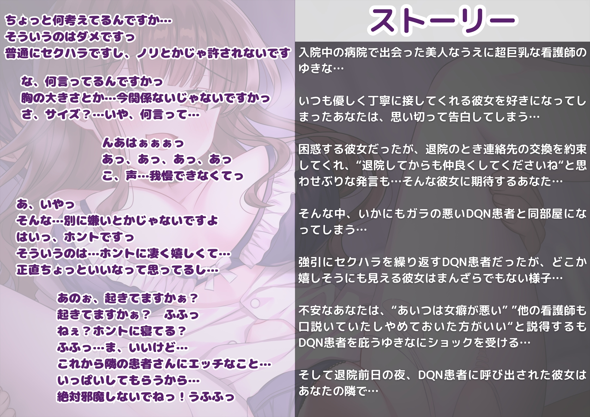 入院中に出会った美人で超巨乳な看護師のゆきな…彼女を好きになってしまったあなたは思い切って告白してしまう…困惑する彼女は退院の時に連絡先の交換を約束してくれ期待するあなた…そんな中、ガラの悪いDQN患者と同部屋になってしまう… 強引にセクハラを繰り返すDQNとどこか嬉しそうな彼女…不安なあなたは“やめておいた方がいい“と説得するもDQNを庇うゆきなにショックを受ける…そして退院前日の夜、DQNに呼び出された彼女はあなたの隣で…