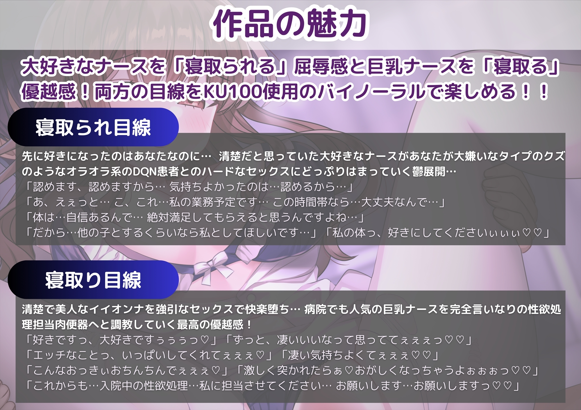 | タグ | バイノーラル/ダミヘ ASMR ナース 寝取られ 中出し フェラチオ オホ声 巨乳/爆乳 |