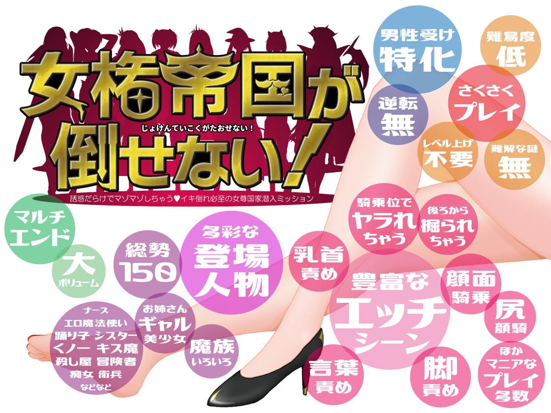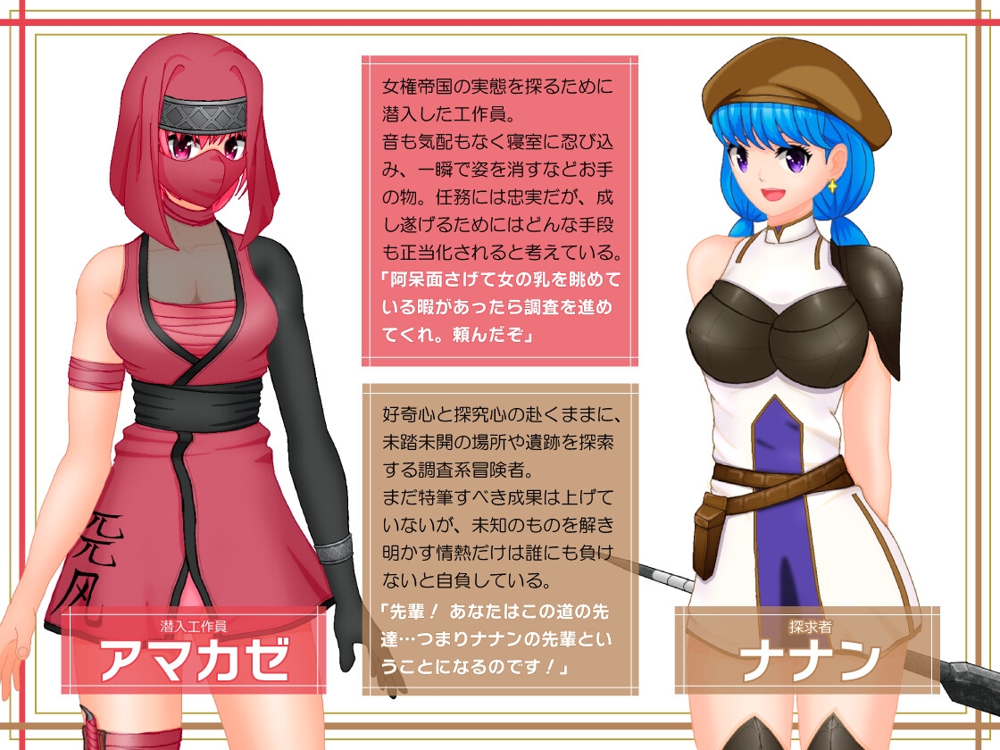 突然勃興した女権帝国の実態を調査し、さらには元の国に戻せという無茶ブリミッションを授かった主人公。 圧倒的に女性優位な国で次々襲いくるドエロい誘惑に翻弄されながら、任務を果たすことはできるのか! それとも抵抗虚しくマゾ堕ちさせられてしまうのか! 世界の平和を背負わされた急造スパイを演じる、男性受け一辺倒のファンタジーRPG!