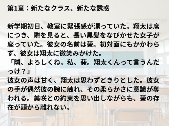 新学期初日、カップルの翔太と美咲は別のクラスに。翔太はクラスメイトの葵に、美咲は蓮に誘惑され、初日から禁断のセックスに溺れる。お互いを愛しながらも、新しい相手との情熱的な関係に翻弄される二人。罪悪感と悦びの狭間で、彼らの青春は甘く、危うく揺れる。新学期の教室で、純潔は散り、肉体は正直に反応する。裏切りと愛が交錯する、淫靡で切ない青春官能小説。