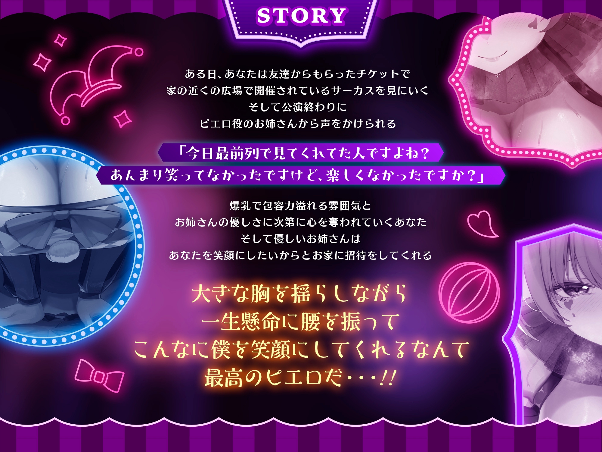 ある日、あなたは友達からもらったチケットで 家の近くの広場で開催されているサーカスを見にいく。そして公演終わりにピエロ役のお姉さんから声をかけられる。「今日最前列で見てくれてた人ですよね?あんまり笑ってなかったですけど、楽しくなかったですか?」 爆乳で包容力溢れる雰囲気とお姉さんの優しさに次第に心を奪われていく。大きな胸を揺らしながら一生懸命に腰を振って こんなに僕を笑顔にしてくれるなんて最高のピエロだ・・・!!