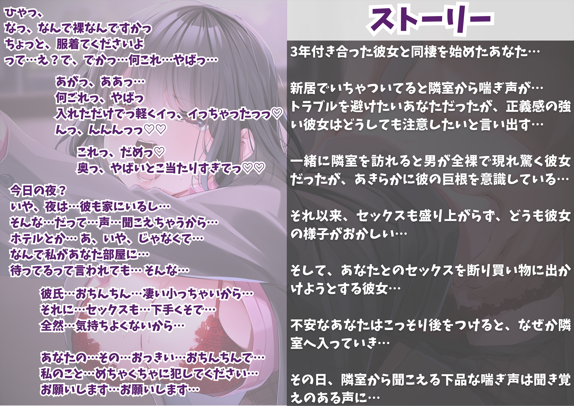 3年付き合った彼女と同棲を始めたあなただったが、隣室から喘ぎ声が…どうしても注意したいと言い出す彼女…隣室を訪れると男が全裸で現れ驚く彼女だったが、あきらかに彼の巨根を意識している…それ以来どうも彼女の様子がおかしい…そして、あなたとのセックスを断り買い物に出かけようとする彼女…不安なあなたはこっそり後をつけると、なぜか隣室へ入っていき…隣室から聞こえる下品な喘ぎ声は聞き覚えのある声に…