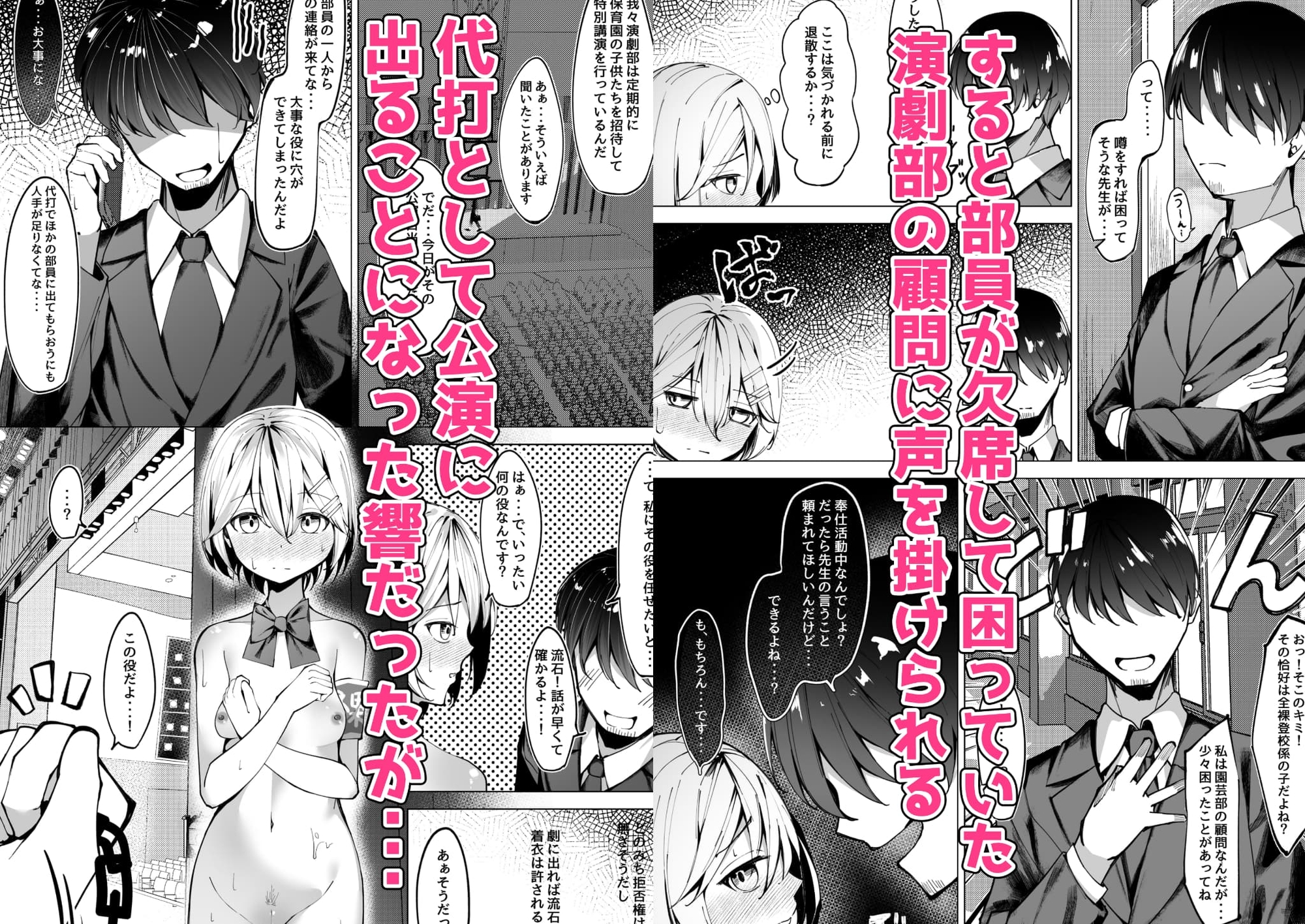 全裸登校係としての仕事である奉仕係にて、演劇部の欠員が出てしまったため代わりに舞台に出てほしいとの依頼を受けてしまったヒロインの響。