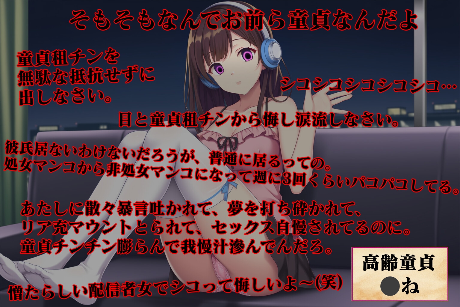 高齢童貞への暴言侮辱、現実突き付け、画面越しの寝取られ、非処女性活マウント、冥途のシコらせです。