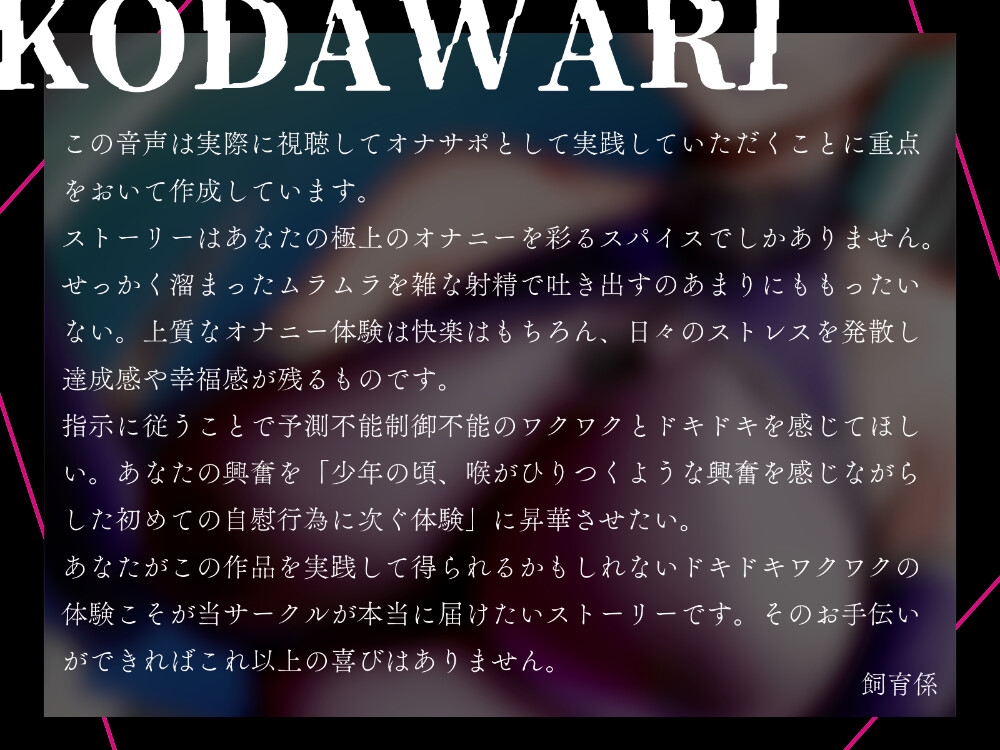 しこらないオナニーをしたことはありますか?ペニスの弱点に固定したローターを指示通りに動かしてカウントダウンでの射精を目指すJOIゲーム音声です。全裸四つん這いの状態で身動きは禁止。動かしていいのはコントローラーを操作する指先だけ。マゾ家畜として淡々と搾精される尊厳破壊の機械○体験をお楽しみください♪