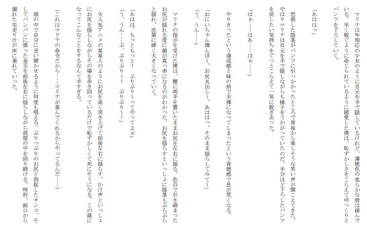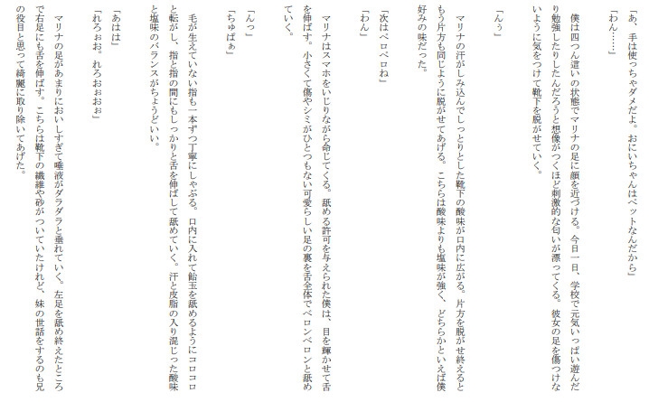 | タグ | フェチ マニアック/変態 妹 手コキ 足コキ 羞恥/恥辱 男性受け アナル |