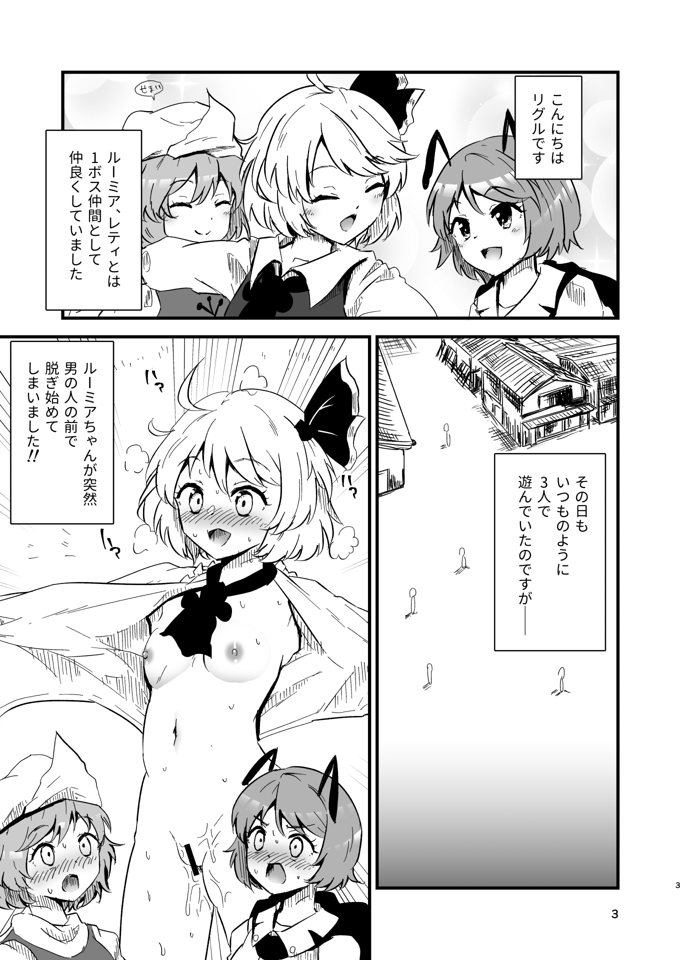 突然男性の前で服を脱ぐルーミア。 その場でルーミアに襲いかかるとなんと処女だった! ルーミアに続いてレティとリグルも…!? 幻想郷エロ能力化異変 第19弾!