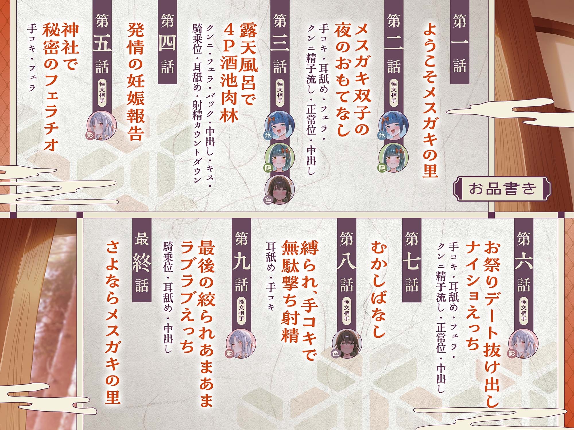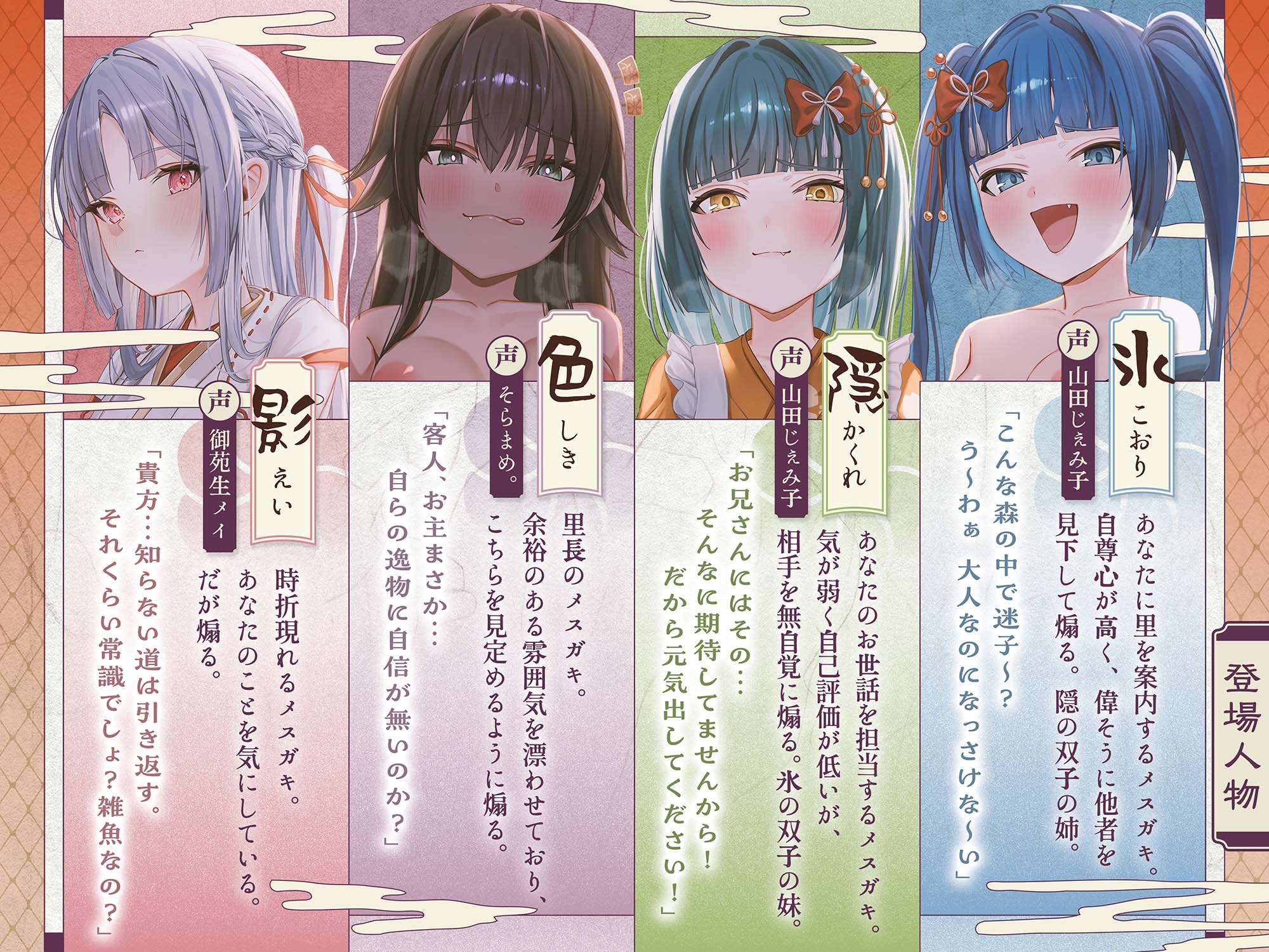 | タグ | ASMR つるぺた ざぁ~こ♡ 着物/和服 ラブラブ/あまあま ファンタジー 妊娠/孕ませ 耳舐め |