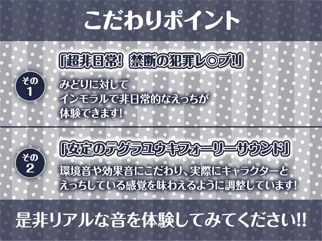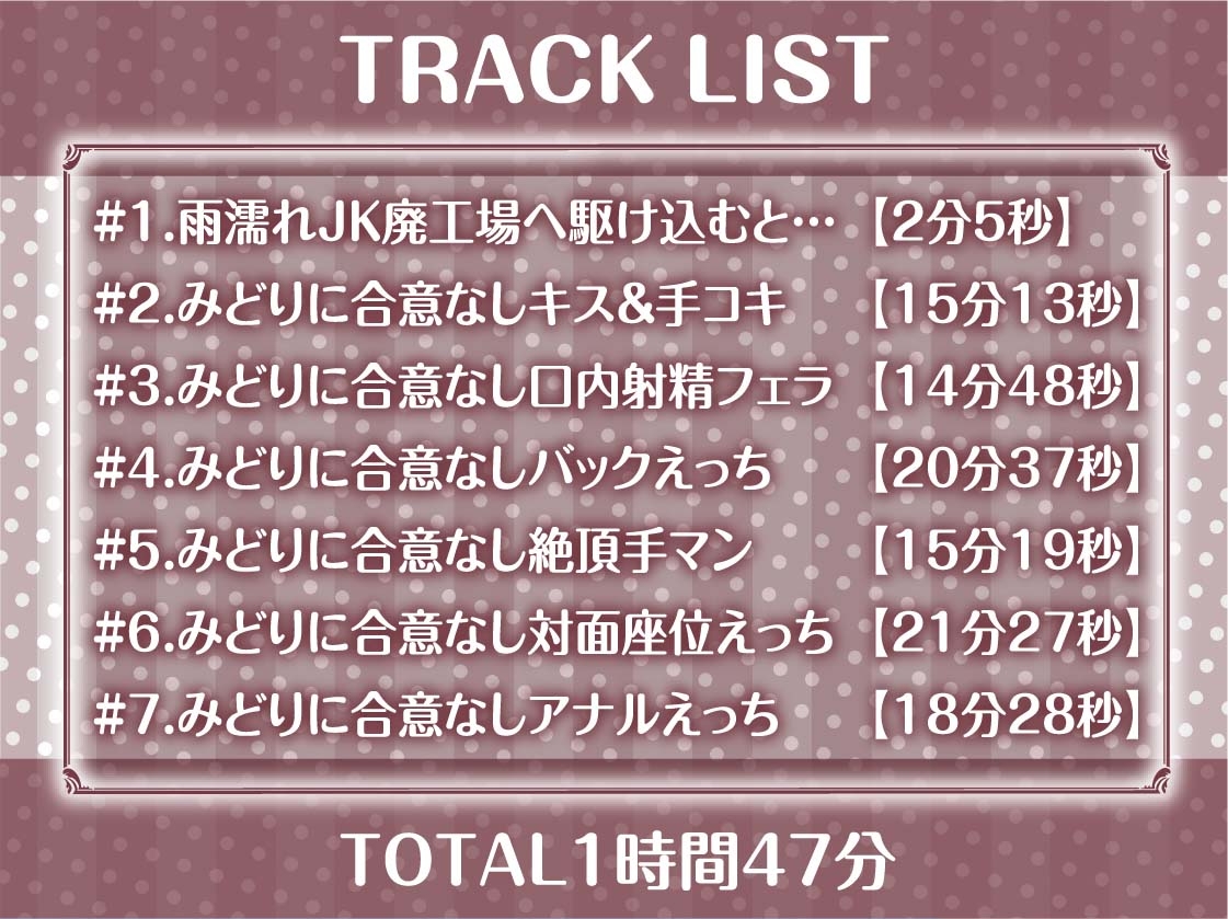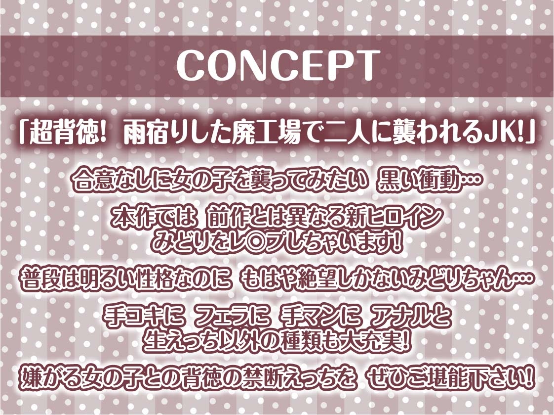 急に雨が降ったので 廃工場へ駆け込んだ JKみどり… するとそこには 二人のおじさんたちが! 雨宿りしているのかと思い 彼女が声をかけると なんと襲われてしまった! キスに手コキに口内射精フェラ! 自分の命を心配して 彼らに従うしかないみどり! 嫌がるもついには バックえっちをしてしまい…