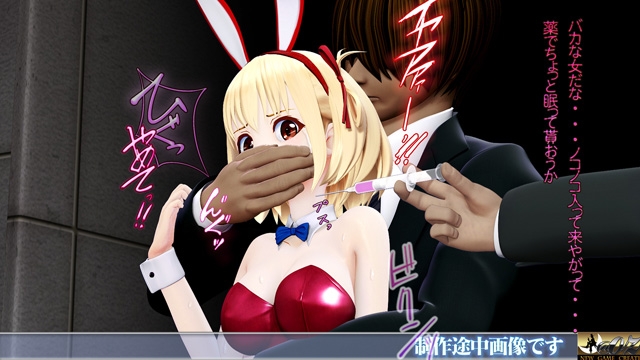 ヒロインは深紅のバニーガールの衣装に身を包み潜入工作を開始します。