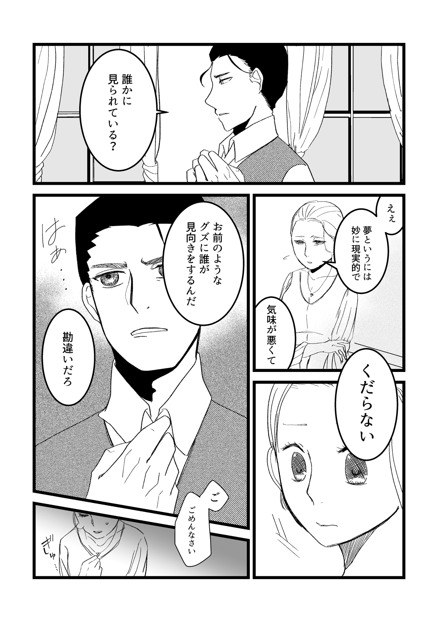 そのまとわりつく視線に気味悪さを覚え夫に相談するも、相手にしてもらえない。自分を見てもらえない。