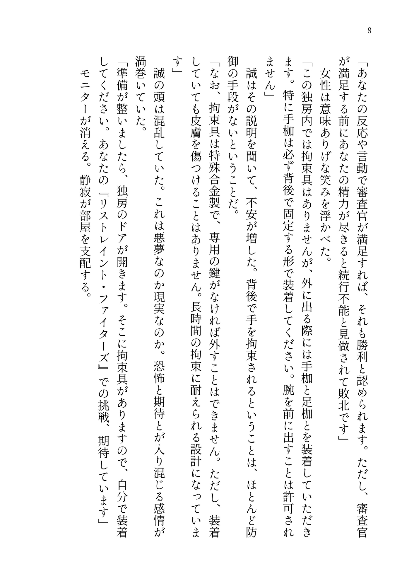 西暦20XX年、国際的な規制緩和により「戦闘能力測定特別法」が制定され、「リストレイント・ファイターズ」という特殊格闘大会が誕生した。表向きは拘束状態の戦闘能力測定が目的だが、その実態は裏社会の権力者たちの娯楽と人間の心理的限界・欲望研究だった。