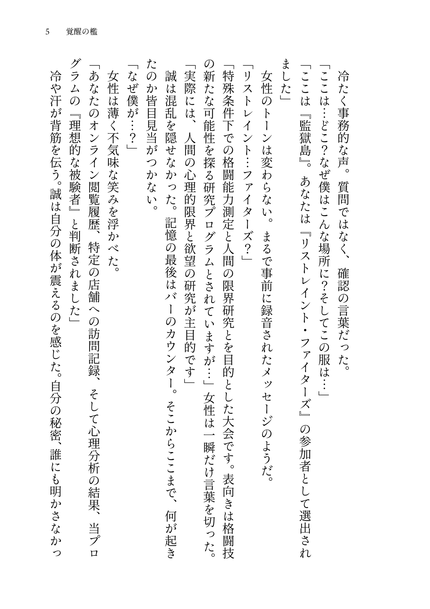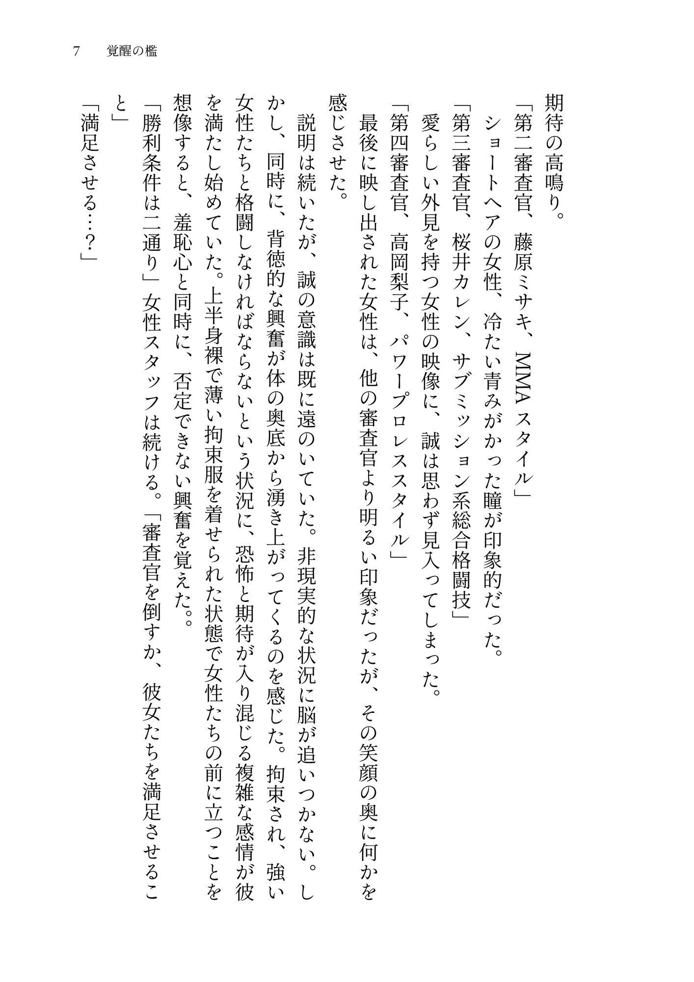手枷と足枷とで拘束された状態から始まる特殊格闘大会。監獄島で待ち受ける複数の女性審査官は、格闘で男を屈服させる術を知り尽くしていた。痛みを快感に変える男の覚醒と、彼を痛めつける喜びに目覚める女の嗜虐心。格闘と被虐とが交錯する唯一無二のM格闘官能小説。
