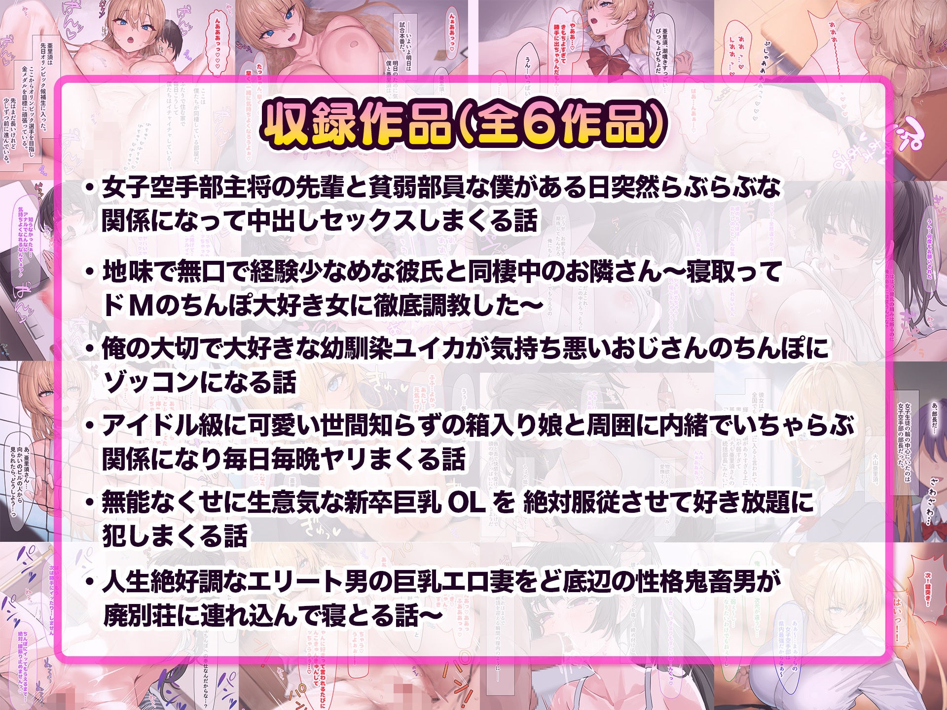 今作は6作品総集編の第4弾 大ヒットを記録した「女子空手部主将の先輩と貧弱部員な僕がある日突然らぶらぶな関係になって中出しセックスしまくる話」や生意気な新卒OLを性教育しちゃう話などなど「強い女が最後はおちんちん大好きな甘えん坊に変わっちゃう」作品が盛りだくさんです!!