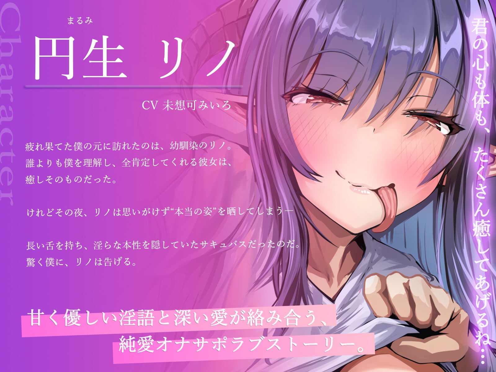 あなたの事をいつも全肯定してくれる優しい幼馴染のリノ。 仕事で悩んでいたのでリノに癒してもらおうと思ったのだが、リノの秘密を知ってしまうことに…。 いつもの優しいリノとは違い、サキュバス化したリノはとてもエロくていやらしい姿。 長くてエロい舌をグポグポ耳に出し入れされると、そのまま脳までジュポジュポ舐められてしまいます。