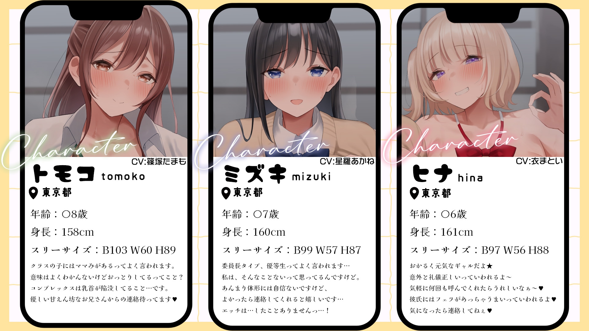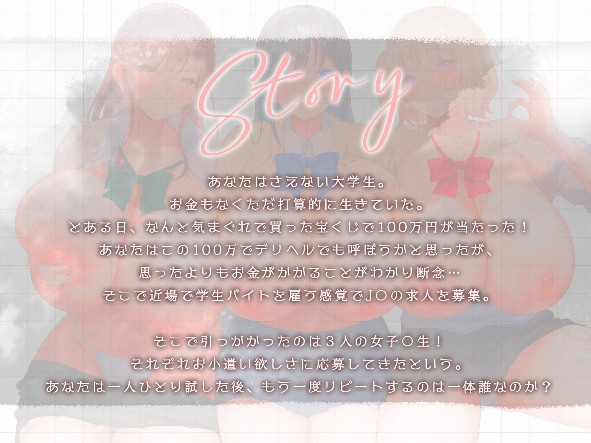 あなたはさえない大学生。 お金もなくただ打算的に生きていた。なんと気まぐれで買った宝くじで100万円が当たった! あなたはこの100万でデリヘルでも呼ぼうかと思ったが、 思ったよりもお金がかかることがわかり断念… そこで近場で学生バイトを雇う感覚でJ〇の求人を募集。 そこで引っかかったのは3人の女子〇生! それぞれお小遣い欲しさに応募してきたという。 あなたは一人ひとり試した後、もう一度リピートするのは一体誰なのか?