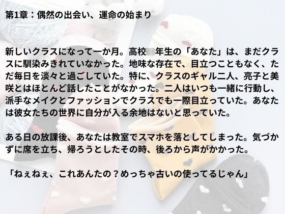 新しいクラスになって一か月。地味な存在だった「あなた」は、クラスのギャル2人、亮子と美咲とほとんど話したことがなかった。しかし、ある事件をきっかけに、3人は急接近。放課後の教室で、亮子の大胆なフェラと美咲の挑発的なキスに翻弄され、甘い秘密を共有するようになる。